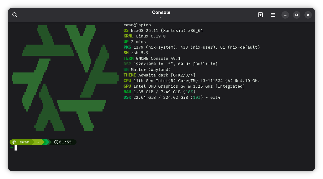 The Dell Inspiron runs NixOS with GNOME, and it's... fine? It works. GNOME boots, Firefox launches with my extensions pre-installed, VS Code has my settings, Git knows who I am. The wallpaper is set through Home Manager (which still feels needlessly complex for "use this image as my background," but whatever).